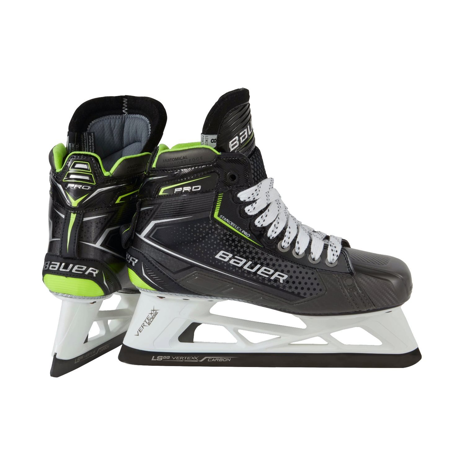 Bauer Pro Goal målvaktsskridsko på elitnivå har nu ett helt nytt FIT-system för att optimera passformen och kombinera de bästa funktionerna i Vapor- och Supreme-serien. Skridskon är konstruerad med en 3D kompositram kallad CARBON CURV. Det kombinerat med tekniken i STANCEFLEX PRO möjliggör optimal flexibilitet och rörlighet på övre delen av skridskon, medan den nedre delen har en otrolig stabilitet och struktur mot isen. Egenskaperna bidrar till möjligheten till att vara rörlig, men samtidigt ha stabiliteten för ett starkare tryck i frånskjut och sidorörelser under spelet. Passformen i Bauer PRO målvaktsskridskor är optimerad för att vara mer anatomisk än tidigare och motverka skav. Hållbarheten är märkbart förbättrad med PRO LACES och insidan är förstärkt för ökad stabilitet och komfort. AEROFOAM PRO och HYPERSENSE-materialen gör innerfodret otroligt mjukt och lätt. Detta ger ytterligare en dimension ur ett komfortperspektiv och en assymetrisk toe-cap håller foten ordentligt på plats i skridskon. Med Bauer Pro skridskon medföljer Vertexx LS5G stål med en målvaktspecifik AGILITY profil.